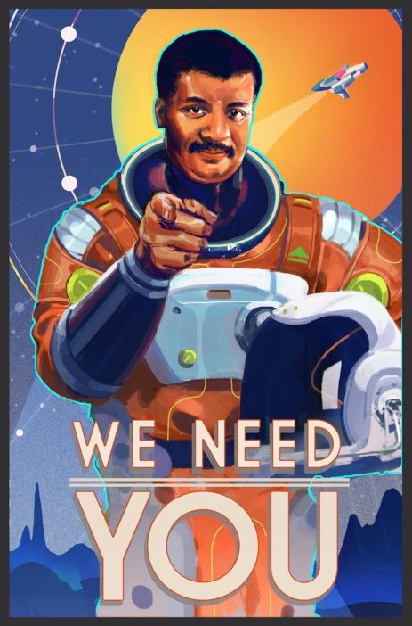 The news for this week is exciting because here at ISDC, we get the first glimpse of what’s coming, not only in space development, but in space gaming. I may not have stopped by this particular booth if it weren’t for a huge display of Neil DeGrasse Tyson in his retro-color glory, pointing at me saying, "WE NEED YOU!," which is absolutely incredible. So I approached the Neil deGrasse Tyson painting to check it out and interviewed the man attending the booth. Check out the podcast episode to hear his description!